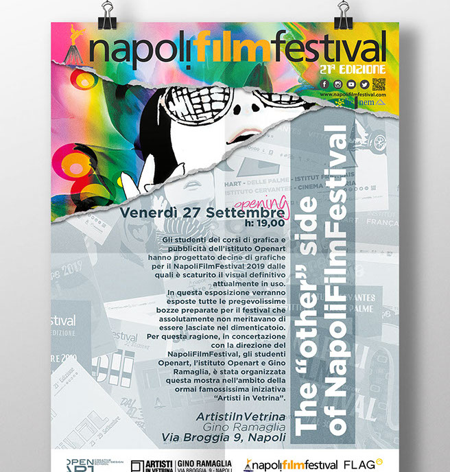 NapoliFilmFestival è per i nostri studenti una occasione didattica unica per mettere in mostra le proprie capacità progettuali e realizzative. Difatti, tutta la comunicazione (ma davvero tutta: dal catalogo ai poster stradali, dal visual ai social, dagli inviti alle scenografie...) del prestigiosissimo Napoli FilmFestival, viene ideata, progettata e realizzata dai nostri studenti sin dal 2017.